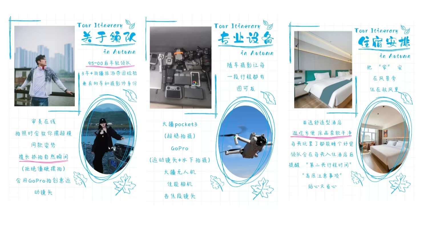 在服务上,我们坚持高品质与个性化。从专业户外装备租赁、特色营地搭建,到小众景点规划、特色美食推荐,每一个细节都精心打磨。此外,还提供灵活的自由行向导服务与精品小团跟团游,满足不同游客的出行需求。